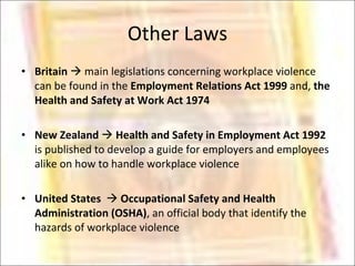 Coping With Threats and Violence. Employees in fact have a legal and ethical duty not to be violent at work and managers have a duty to prevent or stop violence. There are many theories about the causes of workplace violence.