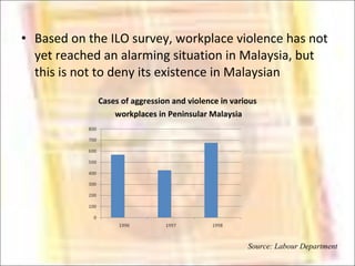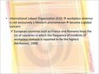 According to the National Institute for Occupational Safety and Health NIOSH in 1996 every week 20 people were murdered and 18000 more assaulted while on the job. Also note that workplace violence or harassment is not limited to incidents that occur within a traditional workplace. What is workplace violence.